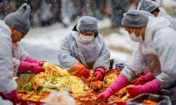 Mọi người tham gia lễ hội làm kim chi được tổ chức giữa tuyết rơi tại chùa Jogyesa ở Seoul