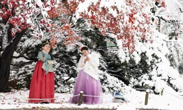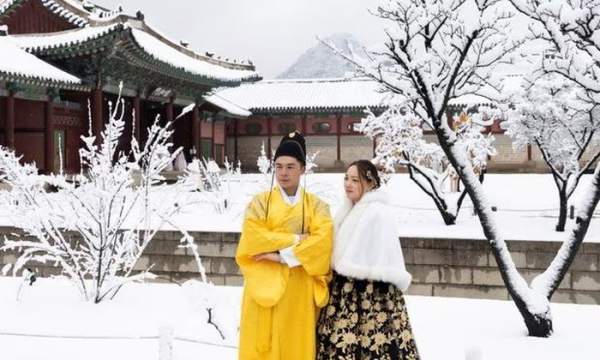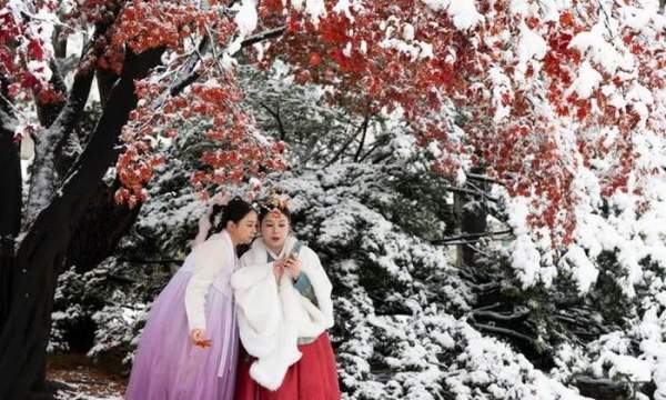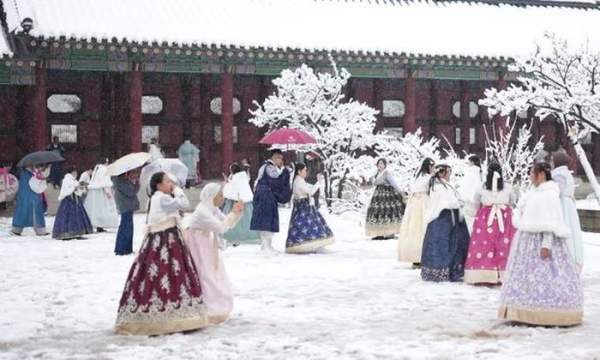 Khách du lịch Macao mặc trang phục Hanbok truyền thống của Hàn Quốc chụp ảnh giữa tuyết rơi tại Cung điện Gyeongbokgung ở Seoul