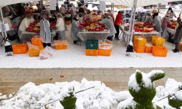 Các Phật tử Hàn Quốc làm món kim chi trong lều giữa tuyết rơi dày