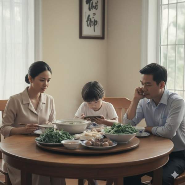 Cảnh tượng quen thuộc trong nhiều gia đình hiện nay: con vừa ăn vừa xem điện thoại, cha mẹ gọi cũng chỉ ậm ừ. Bữa ăn đáng ra là lúc mọi người trò chuyện, chia sẻ chuyện trong ngày, thì nay chỉ còn tiếng muỗng chạm đĩa và ánh sáng phát ra từ màn hình.