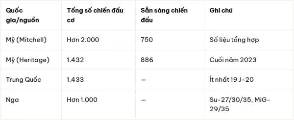 Theo viện Mitchell, Không quân Mỹ hiện sở hữu hơn 2.000 máy bay chiến đấu nhưng chỉ 750 chiếc được đánh giá là sẵn sàng chiến đấu. Báo cáo của Heritage Foundation ghi nhận vào cuối năm 2023, có 886 chiếc trong số 1.432 máy bay đang hoạt động được phân loại “sẵn sàng chiến đấu”. Trong khi đó, Trung Quốc có 1.433 máy bay chiến đấu, bao gồm ít nhất 19 J-20; Nga sở hữu hơn 1.000 chiếc, chủ yếu các dòng Su-27/30/35 và MiG-29/35.