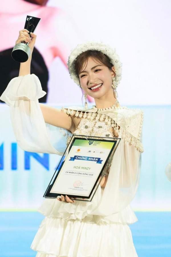 Bên cạnh hoạt động nghệ thuật, Hòa Minzy cũng thường xuyên tham gia các chương trình thiện nguyện, dự án cộng đồng và các hoạt động hỗ trợ trẻ em có hoàn cảnh khó khăn. Đặc biệt, suất thời gian qua, cô liên tục ủng hộ khoản tiền lớn đến các tỉnh thành gặp khó khăn do thiên tai, bão lũ. Việc đạt giải Cá nhân vì động đồng là minh chứng rõ ràng cho những hành động bền bỉ và luôn hướng về cộng đồng của Hòa Minzy.