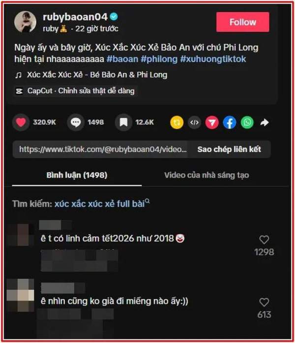 Mới đây, trên kênh TikTok cá nhân, Bảo An đã khiến cộng đồng mạng "dậy sóng" khi đăng tải đoạn clip tái hiện hình ảnh trong MV Xúc Xắc Xúc Xẻ cùng chú ruột - nam diễn viên Phi Long sau hàng chục năm.