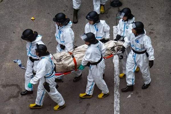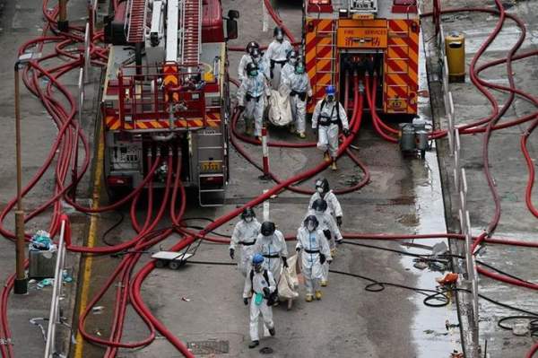Lính cứu hỏa mang theo các thi thể được tìm thấy từ các tòa nhà dân cư bị hỏa hoạn.