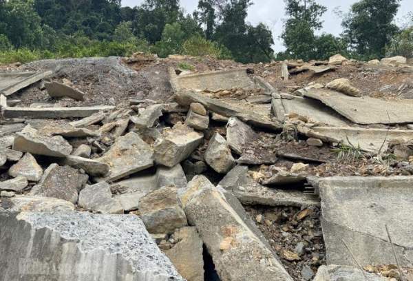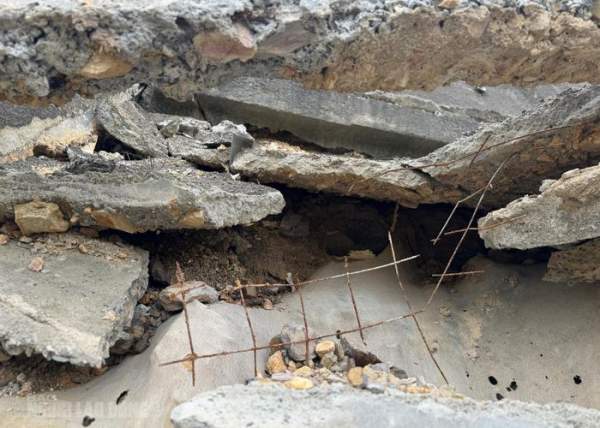 Nhiều tấm bê tông lớn bị nứt gãy, vỡ vụn và trượt chồng chất lên nhau, tạo thành một đống hỗn độn gồm đá, đất và bê tông.