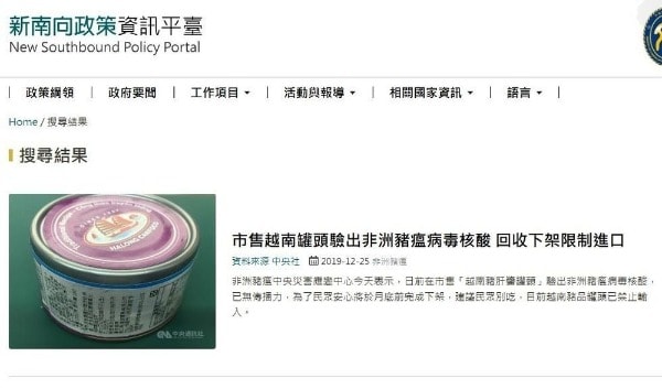 Theo thông tin từ Hãng thông tấn Trung ương Đài Loan (CNA), cuối năm 2019, Trung tâm Ứng biến khẩn cấp Trung ương về dịch tả lợn châu Phi (CEOC) của Đài Loan đã phát hiện axit nucleic của virus dịch tả lợn châu Phi trong một sản phẩm pate gan heo đóng hộp xuất xứ Việt Nam đang được bày bán trên thị trường.