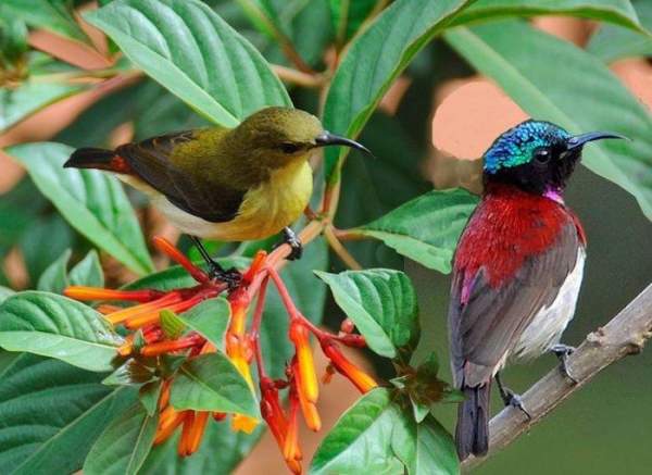 Màu sắc sặc sỡ ở con đực. Con đực của nhiều loài chim hút mật sở hữu bộ lông ánh kim xanh, tím, đỏ hoặc vàng rực, phản chiếu ánh sáng mặt trời như kim loại, trong khi con cái thường có màu lông trầm hơn để ngụy trang. Ảnh: Pinterest.