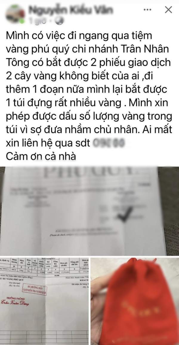 Hôm qua (3/2), mạng xã hội lan truyền bài đăng thông báo tìm chủ nhân túi đựng nhiều vàng từ tài khoản Facebook Nguyễn Kiều Vân. Theo nội dung bài đăng, người này cho hay mình có việc đi ngang qua đoạn đường Trần Nhân Tông (Hà Nội) và vô tình nhặt được 2 phiếu giao dịch 2 cây vàng.