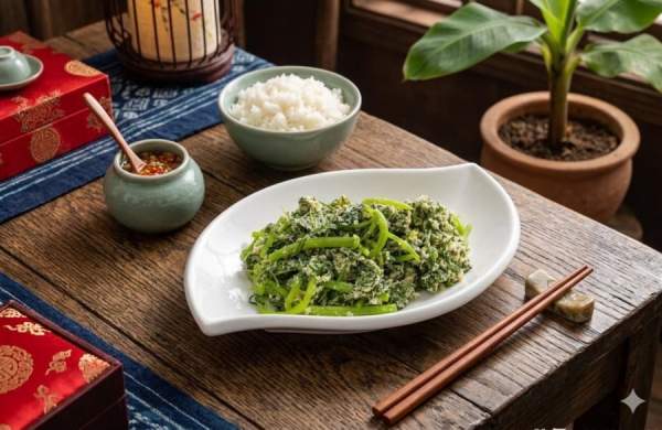 Rau cải cúc hấp trộn thính thơm bùi, no mà không nặng